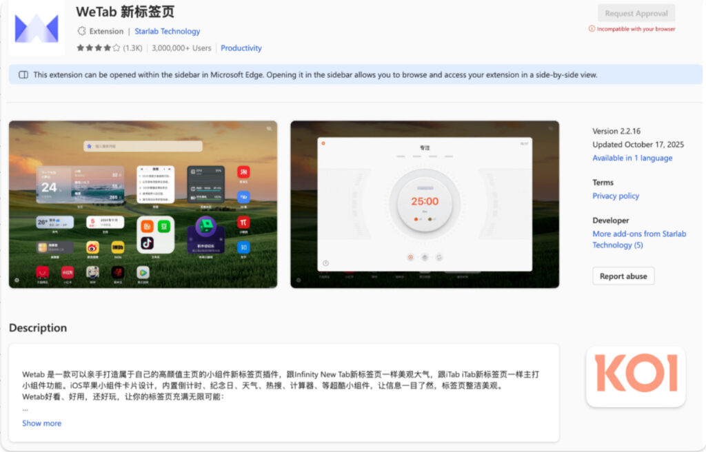 This phase marks the largest and still-active surveillance operation. Five extensions under Starlab Technology, a publisher linked to the earlier campaigns, have amassed over 4 million installs on Edge, including WeTab 新标签页 (New Tab Page) with 3 million users. These extensions are currently live in the Microsoft Edge store and continuously exfiltrate data to 17 servers, many located in China.