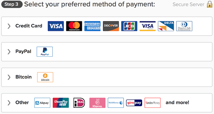 ExpressVPN – ExpressVPN supports a wide range of payment options, including all major credit cards, PayPal, Bitcoin, as well as other payment processors.