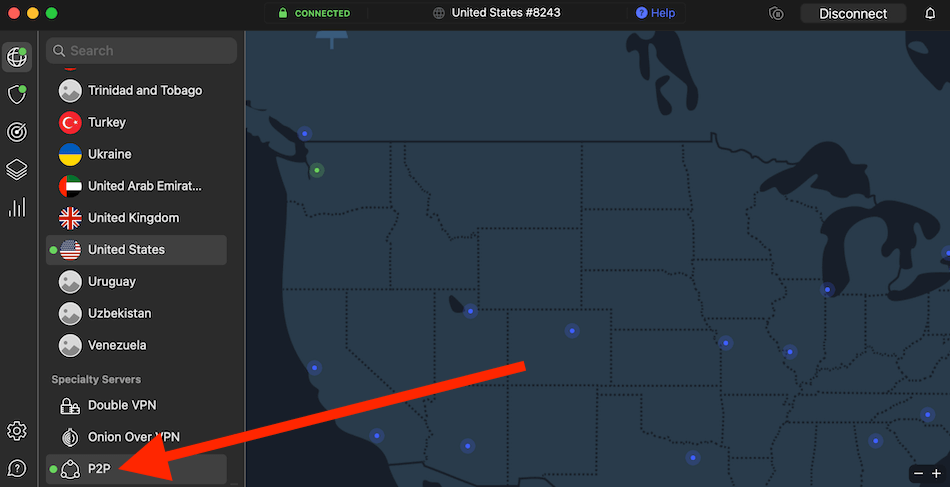 In contrast to ExpressVPN, NordVPN apps take up a bit more space but also include more options. You can see on the left side of the NordVPN client the specialty servers and country locations. You can also quickly select a server location with only one click from the global map, as you can see below: