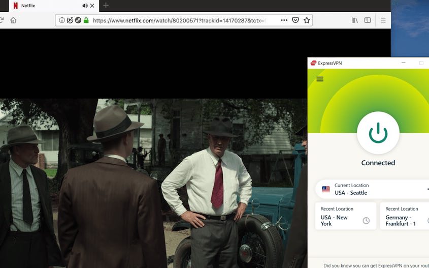We've done lots of testing, and ExpressVPN has proven to be one of the best VPNs for streaming. They do a great job unblocking Netflix libraries, have plenty of streaming-capable servers around the world, and are fast enough to get the job done right. That's why you will find them on our list of the best VPNs to unblock Netflix. Below, I'm streaming Netflix with an ExpressVPN server in Seattle.