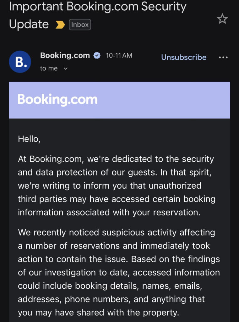 Booking.com’s notification advises recipients to be cautious of suspicious emails or phone calls and reiterates that the company does not request sensitive financial information via email, SMS, or messaging apps. The inclusion of these warnings suggests concern that exposed data could be leveraged in follow-up scams targeting affected individuals.