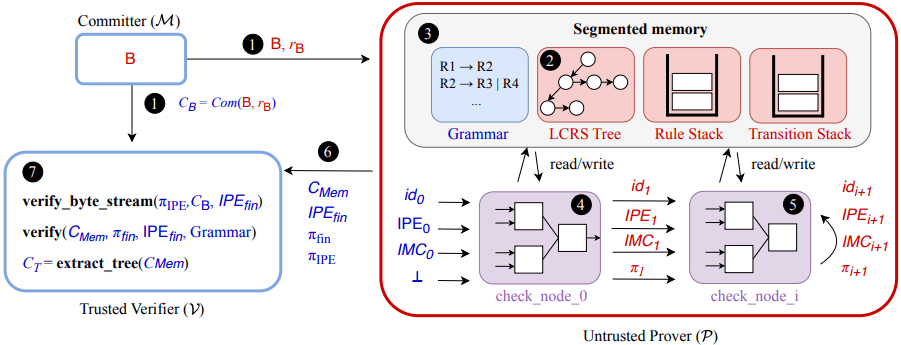 Memory management is handled through a segmented memory model. Coral separates public grammar rules, persistent private data, and volatile stacks used during tree traversal, all accessible through a unified interface optimized for zero-knowledge execution.