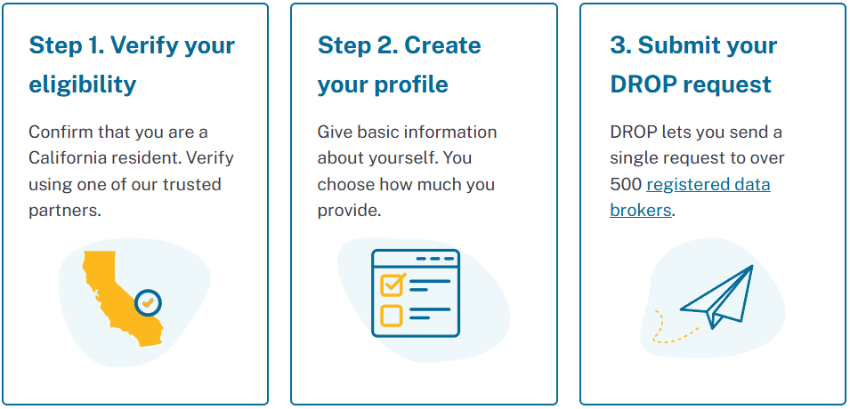 DROP allows any verified California resident to initiate a data deletion request. Verification is handled through the California Identity Gateway, a secure state-run authentication service, or alternatively through Login.gov. Users are not required to create permanent accounts and can limit the amount of information shared. Once verified, a profile is created with the minimum necessary details to allow data brokers to identify and erase personal records.