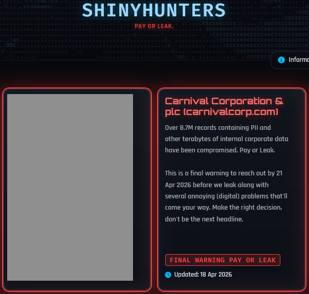 ShinyHunters listed Carnival Corporation on its “pay or leak” portal on April 18, alleging the theft of over 8.7 million records containing personally identifiable information (PII) along with large volumes of internal corporate data. The attackers issued a deadline of April 21, 2026, warning that failure to engage would result in public data exposure and additional disruptive actions.