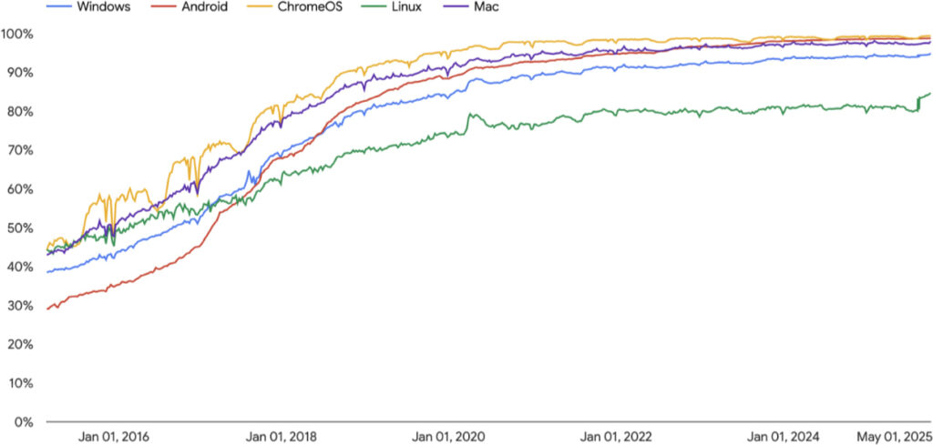 While 95–99% of Chrome page loads already occur over HTTPS, Google's transparency reports indicate that this rate has stagnated since around 2020. This remaining 1–5% of traffic still represents a substantial security risk, especially because a single insecure navigation can be enough for an attacker to gain a foothold. HTTP navigations are often invisible to users due to automatic redirection to HTTPS, which removes any opportunity to intervene before a potential compromise.