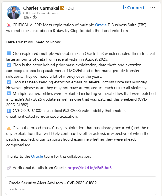 Mandiant’s CTO Charles Carmakal revealed that Clop exploited multiple flaws in Oracle EBS, some patched in Oracle’s July 2025 update and one patched only on October 4, 2025. The critical zero-day, tracked as CVE-2025-61882, received a CVSS score of 9.8 and allows unauthenticated remote code execution via the BI Publisher integration component over HTTP. This enables attackers to compromise Oracle EBS servers over the network without requiring any credentials.