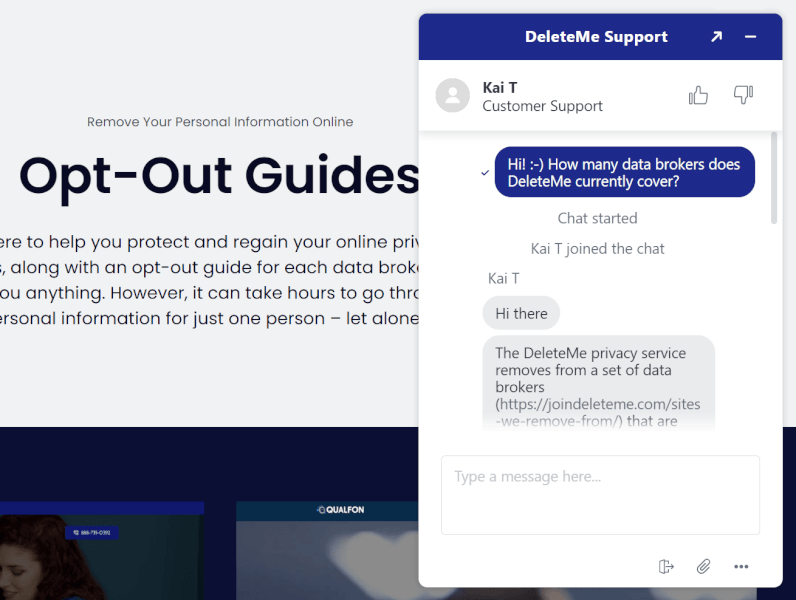 While Incogni doesn't offer as many customer support channels, its team is available 24/7 via live chat. In contrast, DeleteMe's customer support is available via chat only during business hours.