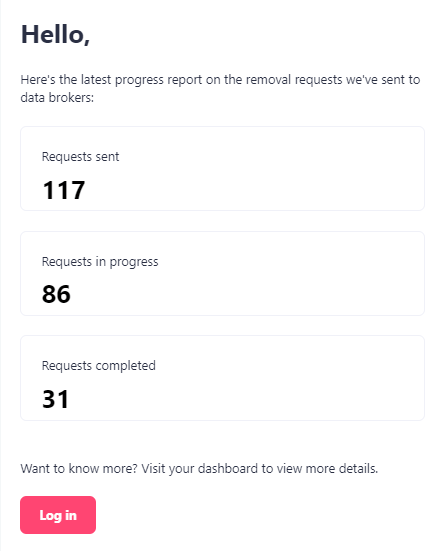 DeleteMe still holds the crown for thorough reporting. Their reports don’t just tell you your data was removed — they walk you through the whole journey. You’ll see how many listings were reviewed, which ones were successfully scrubbed, which are still pending, and even a rough estimate of how long the cleanup will take. It’s like getting a full progress diary of your personal information being pulled off the web.
