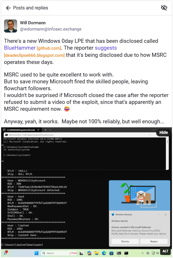 Despite the lack of a technical explanation, the exploit has been independently validated. Security researcher Will Dormann confirmed on Mastodon that the BlueHammer exploit successfully escalates privileges on Windows systems. In his testing, a non-administrative user was able to spawn a command prompt with SYSTEM-level privileges, demonstrating full compromise of the affected machine. Dormann noted that while the exploit is not entirely reliable, it works “well enough” to be considered a credible threat.