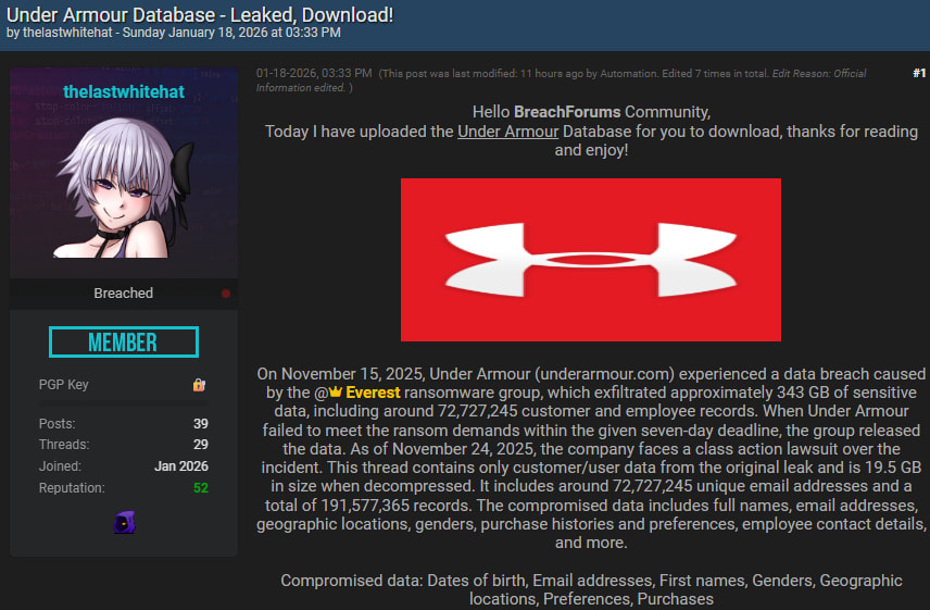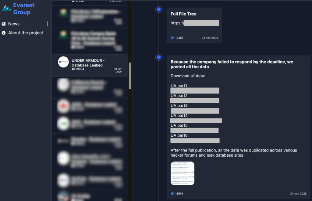 The breach was first publicly claimed by Everest in late 2025 as part of a ransomware extortion attempt. The group alleged it had exfiltrated 343GB of data from Under Armour and threatened to leak the information unless a ransom was paid within a seven-day deadline. After no ransom payment was reported, the attackers published the data on their dark web leak site. By January 2026, the dataset had spread to underground forums.