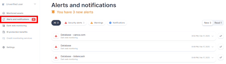 You’ll spot categories like “Monitored assets” and “Dark web monitoring,” letting you quickly see what’s being watched and where there might be a red flag. Keeping an eye on your finances? The “Credit monitoring services” tab has you covered with up-to-date alerts.