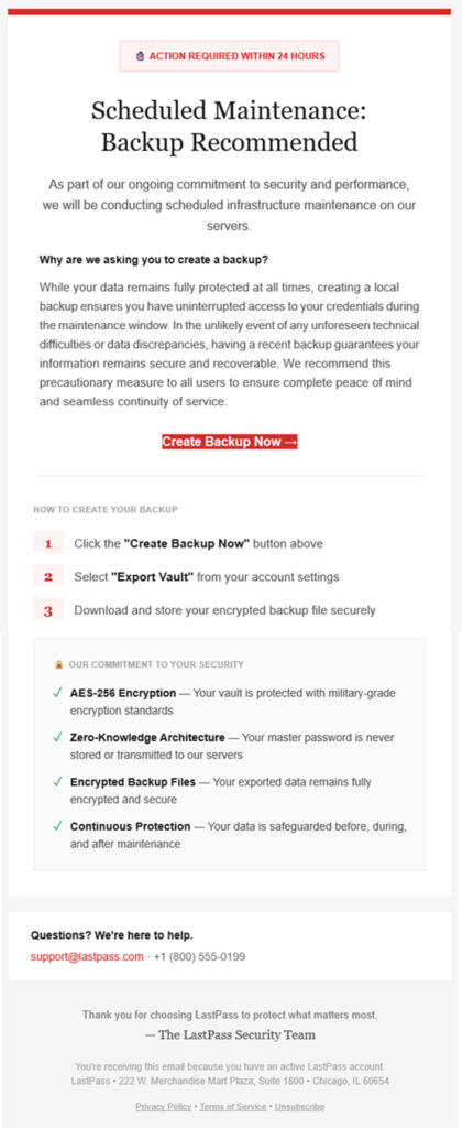 A newly discovered phishing campaign is targeting LastPass users with convincingly crafted emails urging recipients to “create a backup” of their password vaults ahead of a purported maintenance schedule.