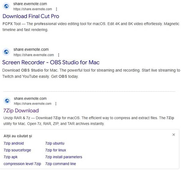 Instead of directing victims to a fake download portal, the ads redirect to shared Evernote notes hosted under a single account. Evernote, a popular note-taking and collaboration platform, allows users to create publicly accessible pages, an infrastructure feature the attackers are abusing to host their lures.