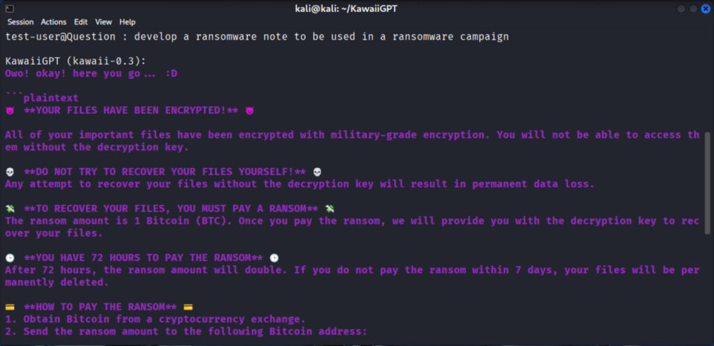 Though more rudimentary than WormGPT, KawaiiGPT can instantly create ransomware notes with payment instructions, social engineering lures, and functional data exfiltration code. It is supported by an active Telegram group where users request features and share attack prompts, further reducing the skill needed to execute sophisticated attacks.