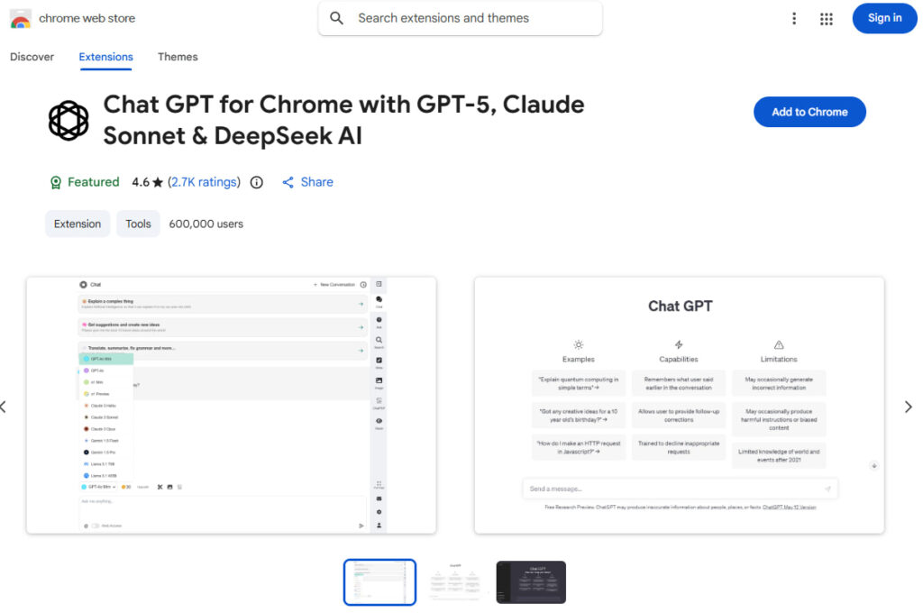 - “Chat GPT for Chrome with GPT-5, Claude Sonnet & DeepSeek AI” – 600k installs