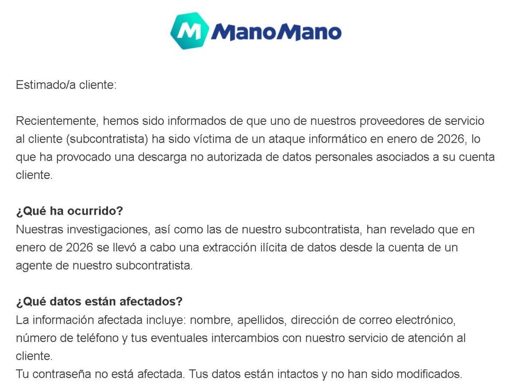The notification, shared yesterday by a Telegram user on the Hackmanac channel, informs customers that ManoMano was alerted to the incident after one of its customer service providers suffered a cyberattack in January 2026. According to the company’s message, the attackers carried out an “illegal data extraction” through the account of one of the subcontractor’s agents, resulting in the download of personal data linked to customer accounts.