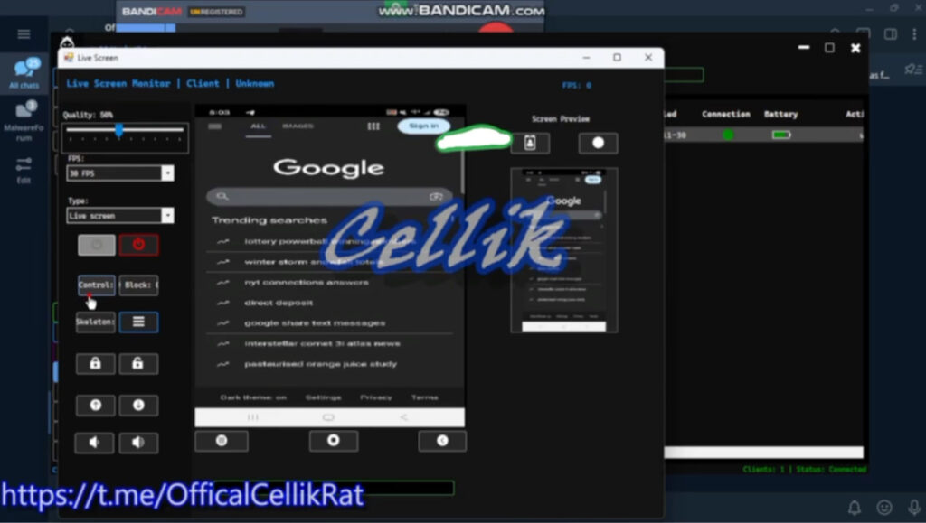 Once installed on a target device, Cellik gives the operator total control. It supports real-time screen streaming with remote interaction, effectively turning the attacker's panel into a live feed of the victim's device with the ability to simulate taps, swipes, and other inputs. This includes live keylogging, allowing attackers to capture everything typed on the device, from messages to login credentials.
