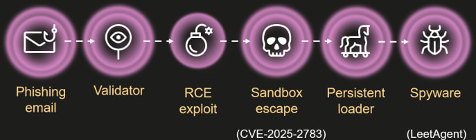 The infection chain used in Operation ForumTroll began with highly targeted phishing emails crafted to appear as legitimate invitations to the Russian “Primakov Readings” expert forum. Victims who clicked the embedded links were redirected to malicious websites that silently exploited a Chrome vulnerability (CVE-2025-2783) to gain code execution. The exploit chain culminated in a sandbox escape using a flaw in how Chrome's Mojo IPC layer interacted with Windows pseudo-handles, allowing attackers to escalate privileges and deploy a persistent malware loader via COM hijacking.