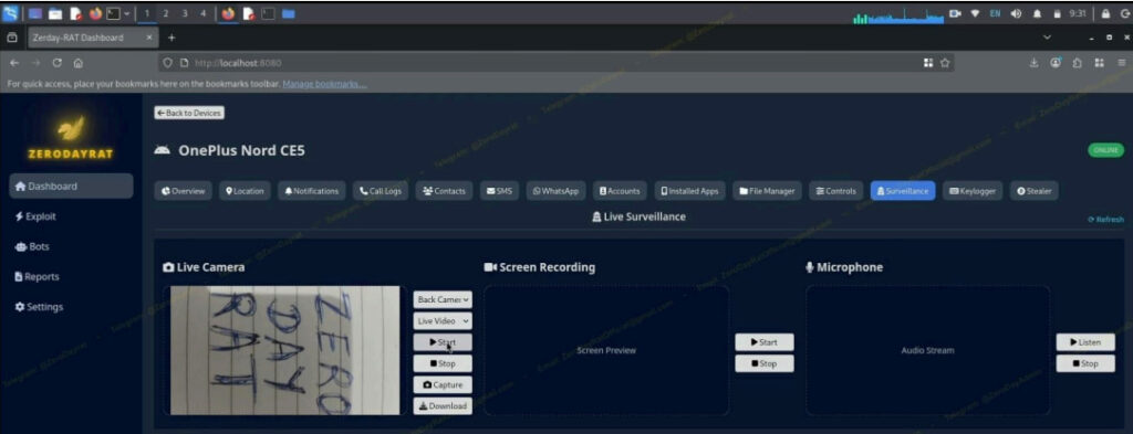 Beyond passive monitoring, ZeroDayRAT grants attackers live access to the victim’s environment. Through the “Surveillance” panel, they can stream video from the front or rear cameras, record the screen in real time, and activate the microphone to eavesdrop on conversations.
