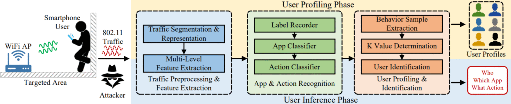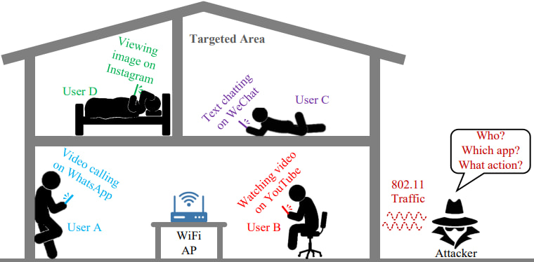 The U-Print threat model, developed by Chinese researchers, assumes that an attacker places a passive sniffer within the wireless range of a target environment (e.g., an office or home). No password or network access is required, only proximity to the Wi-Fi signal. The system then builds behavioral profiles of individuals based on their interaction patterns with apps, potentially enabling inferences about private attributes like age, gender, or even mental health.