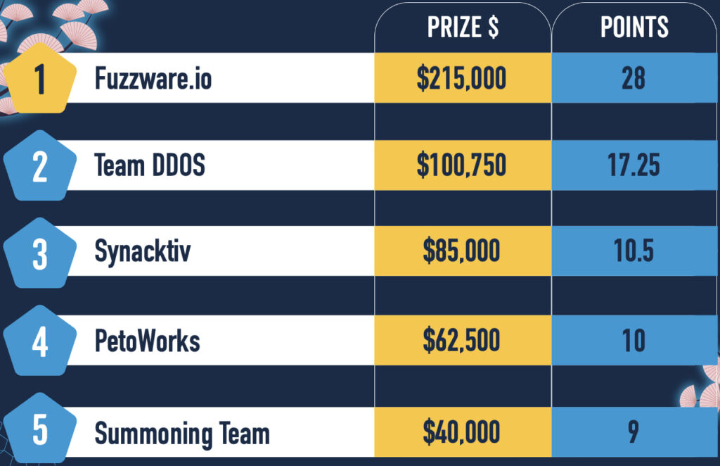Fuzzware.io’s trio, Tobias Scharnowski (@ScepticCtf), Felix Buchmann (@diff_fusion), and Kristian Covic (@SeTcbPrivilege), secured the top honor of “Master of Pwn,” finishing with 28 points and $215,500 in total rewards.