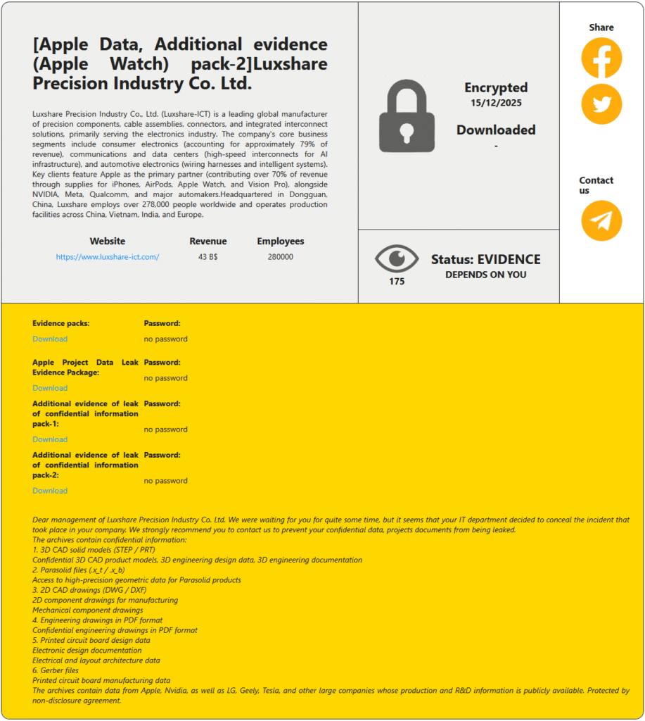 RansomHouse accuses Luxshare’s IT department of deliberately concealing the breach and warns that further leaks may follow if the company continues to ignore the attackers’ demands. The group has not specified a ransom amount or deadline.