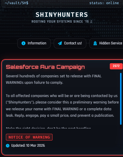 The new “Salesforce Aura Campaign” announcement suggests the group may be attempting to monetize data obtained from misconfigured Salesforce environments across multiple organizations.