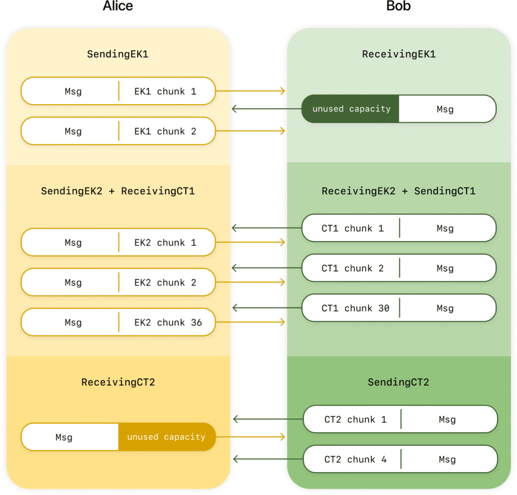 Unlike ECDH, which is compact and synchronous, ML-KEM-based exchanges involve large key and ciphertext payloads (over 1,000 bytes each) and require a careful choreography between participants. To manage this complexity, Signal engineers designed a state machine system where each device tracks its key exchange status and decides how to encode messages accordingly. These exchanges are chunked and protected using erasure coding, allowing for loss-tolerant transmission even on unreliable networks or in the face of active message suppression by attackers.