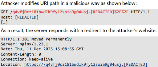 In addition to the TLS-related configuration weakness, SecuRing identified a URL parsing flaw that could be exploited for malicious redirection. By crafting a request with a specially formatted URI, an attacker could trigger the server to issue an HTTP 301 redirect to an attacker-controlled domain. This behavior stemmed from the server misinterpreting parts of the path as an external URL due to insufficient sanitization, potentially exposing users to phishing or traffic hijacking. The issue was mitigated by adjusting URI handling logic to prevent unintended redirects to untrusted destinations.
