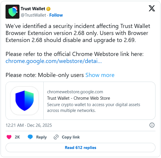Trust Wallet formally confirmed the breach in the early hours of December 26. The company stated that only users of version 2.68 of the browser extension are affected and urged immediate upgrades to version 2.69. Mobile users and those running any other extension version were confirmed to be unaffected.