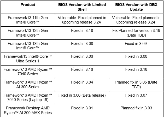 Framework has acknowledged the vulnerability and is actively working on remediations across its product lines. As of this writing: