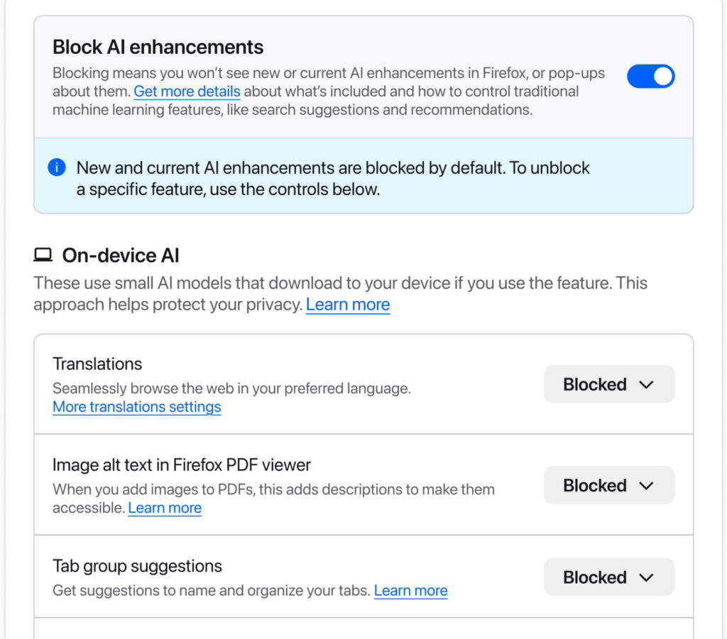 The new feature introduces a dedicated “AI controls” section in Firefox’s desktop settings. From this panel, users can toggle a global switch labeled Block AI enhancements, which disables all current and future generative AI functions. Alternatively, individual features can be enabled or disabled based on preference. Preferences persist across browser updates and can be modified at any time.