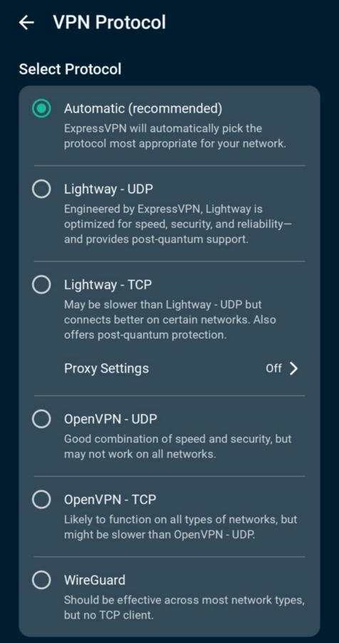 - Lightway protocol with ExpressVPN – This protocol promises to be faster and more lightweight than OpenVPN, while also delivering better mobile performance. Like OpenVPN, it uses an AES cipher.