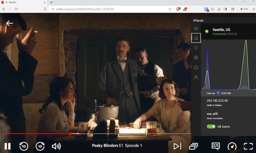 Surfshark does it all, making it one of the best VPNs for Netflix. Officially, Surfshark supports about 17 different Netflix libraries around the world, including all of the most popular regions, such as the US, UK, Canada, and more. Below, we are streaming UK Netflix through a Surfshark server in Seattle: