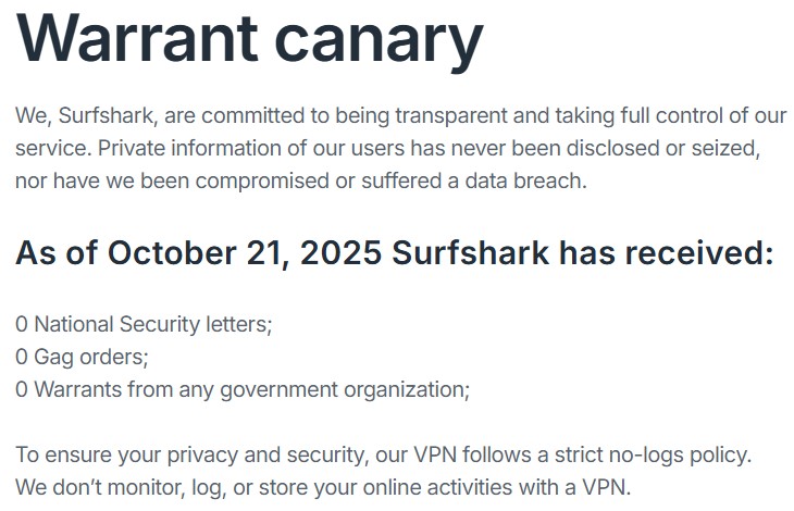 Finally, Surfshark maintains a warrant canary to warn about privacy-related issues. At the time of this review, we have not seen any reports in the warrant canary about surveillance or data collection activities.