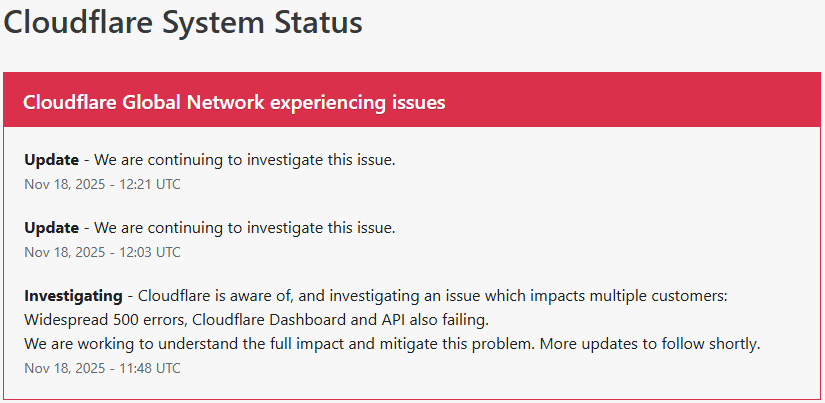 Cloudflare, a critical internet infrastructure provider that offers CDN, DDoS protection, and security services to major websites, is continuing to investigate the root cause of the disruption. No timeline for resolution has been provided as of this writing, and the scope of affected services remains unclear.