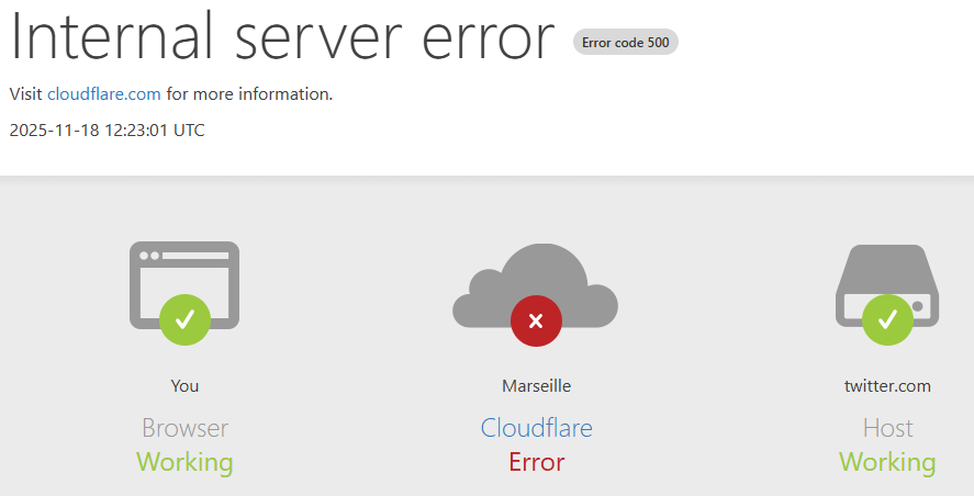 The issue began surfacing around 11:48 UTC on November 18, 2025, when Cloudflare acknowledged a problem affecting its global network. According to the company’s system status page, the disruption is affecting multiple customers, with widespread 500 Internal Server Errors impacting not only user-facing websites but also the Cloudflare Dashboard and API infrastructure. X is among the affected services, though user reports and our own tests suggest reachability varies by region.